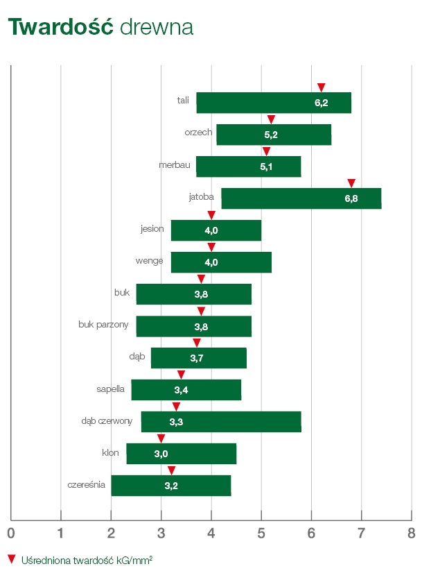 Oprócz koloru podłogi istotne znaczenie przy jej wyborze odgrywa twardość i wytrzymałość drewna. W domu poszczególne pomieszczenia, spełniają różnorodne funkcje. W przypadku sypialni czy gabinetu podłoga nie musi charakteryzować się dużą twardością czy odpornością na ścieranie. Z kolei w salonie, pokoju dziecięcym czy holu właśnie twardość odgrywa znaczącą rolę. Dzięki wyborowi odpowiedniego wykończenia, przy pomocy lakieru czy oleju wzmacniamy pożądane właściwości podłogi, ale w pomieszczeniach narażonych na intensywne użytkowanie warto wybrać także odpowiedni gatunek drewna. Funkcję swego rodzaju przewodnika może spełniać tabela, pokazując twardość drewna wg. skali Brinella.